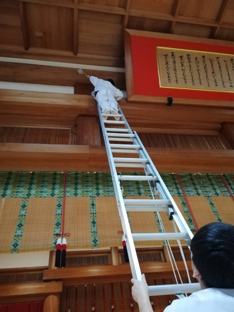 年末恒例の神殿すす払いの日。一年間の大掃除をさせていただきました。 神殿すす払い回廊の灯篭も丁寧に婦人さんがたは雑巾しぼり額縁裏の梁の隅々まで一年のほこりを大掃除 大教会 Share Please!! URLをコピーしました! 教会略史編纂会議 大晦日