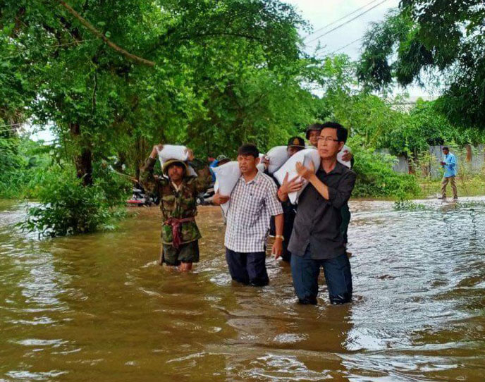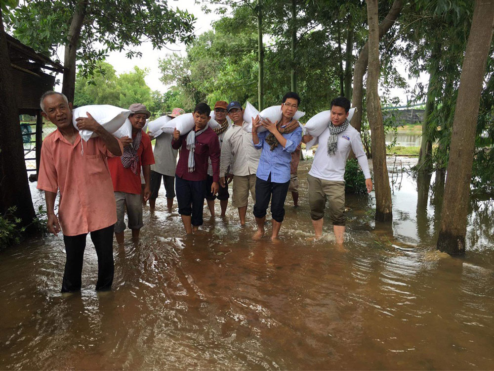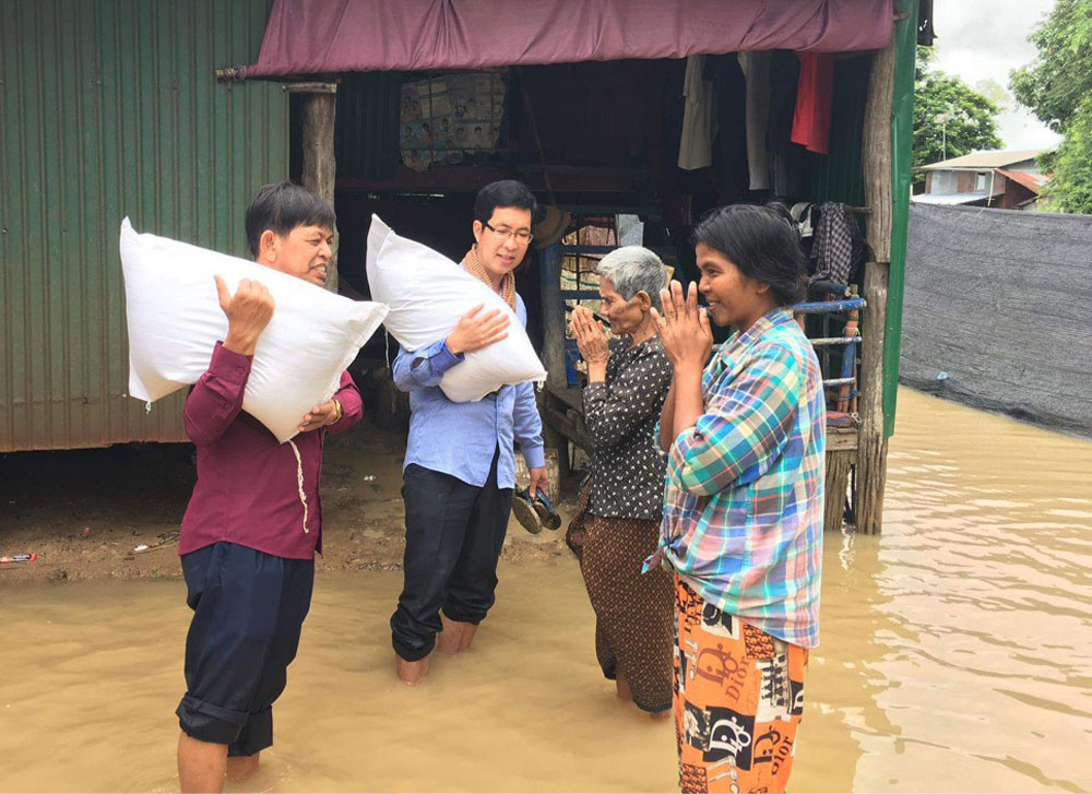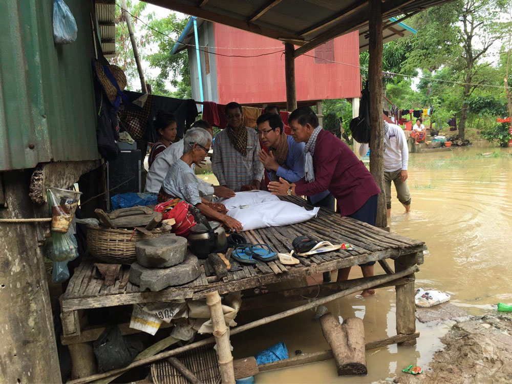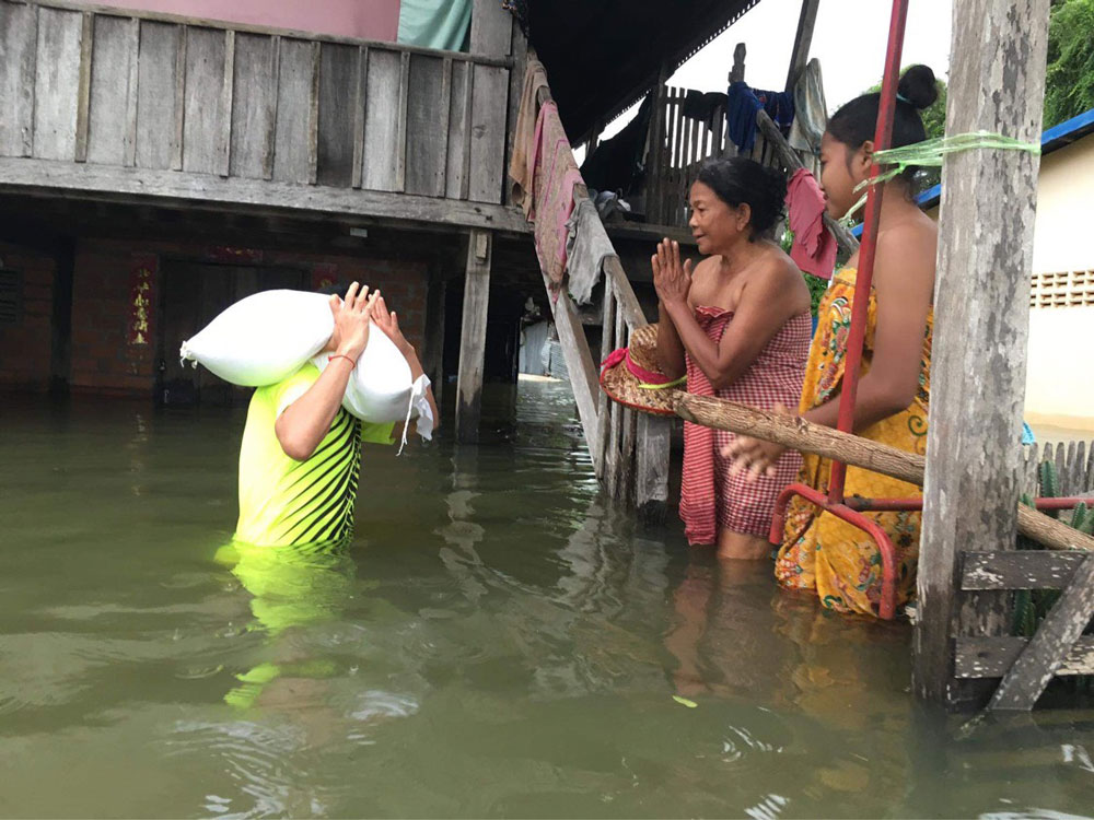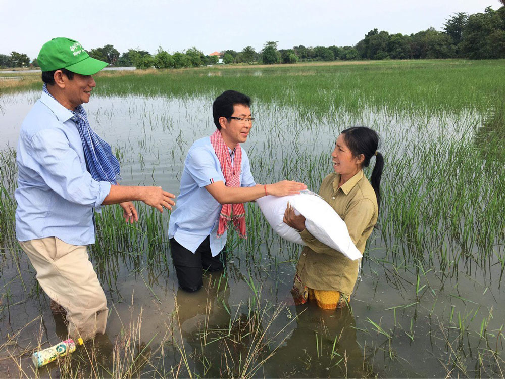 コロナ支援から4ヶ月がたった頃、今度はカンボジアを水害が襲いました。昨年は7月に九州地方が豪雨に襲われましたが、日本の本州への台風の上陸回数が、数十年ぶりに0回という年でした。それによって日本の農家の人々は喜ばれたと思いますが、日本に台風が襲来しない影響で、フィリピン沖からベトナムやカンボジアに向けて台風が北上し、水害をもたらしました。そこでシップ氏より、バッタンバンで水害により住む家を失い、食べる物も無い人々が多くいるので、助けて欲しいと連絡がありました。また私は、神崎会長に今回の水害の状況を説明し、どうにか支援できないかと相談。カンボジア水害支援を行う事が出来ました。マカラ氏を始め、シップ氏やダラシティー氏に出会ったことで、海外布教において大きな一歩を踏み出せました。