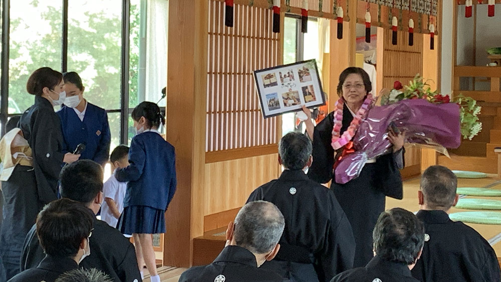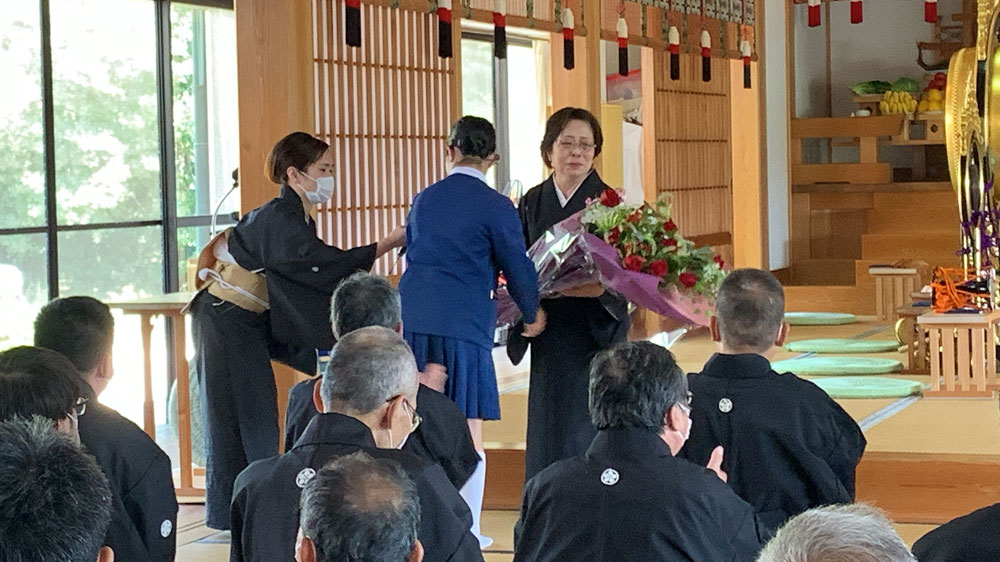 祭典後、新会長の挨拶に続き、現在入院治療中の前会長に代わって挨拶に立った井手ひな前会長夫人に、お孫さんからサプライズの花束や手作りの首飾りが。