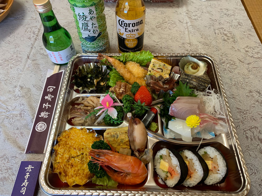 参拝者には、コロナに打ち勝つべくコロナビールを添えたお持ち帰りの折詰が配られました。