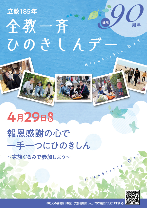 さて、来る4月29日(金曜日・祝日)に「全教一斉ひのきしんデー」が開催されます。ひのきしんは、日々頂戴する親神様のご守護への感謝の心から発する行いであり、いつでも、どこでもできる信仰実践です。そのひのきしんを、土地所に住む皆で心を合わせて一手一つに勤めるのが「全教一斉ひのきしんデー」です。その姿は地域にお道の素晴らしさを映し出すことにもなるでしょう。