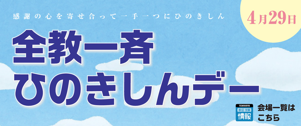 4月29日(土・祝)に毎年実施される「全教一斉ひのきしんデー」の全国会場は、下のバナーをタップしてご確認いただけます。日頃の感謝の気持ちを込めて、是非大勢の方もご参加をお待ちいたしております。 詳しい実施要項はこちらから 大教会からのお知らせ Share Please!! URLをコピーしました! 全教会一斉巡教 6月25日(日)【おぢばがえり団参】